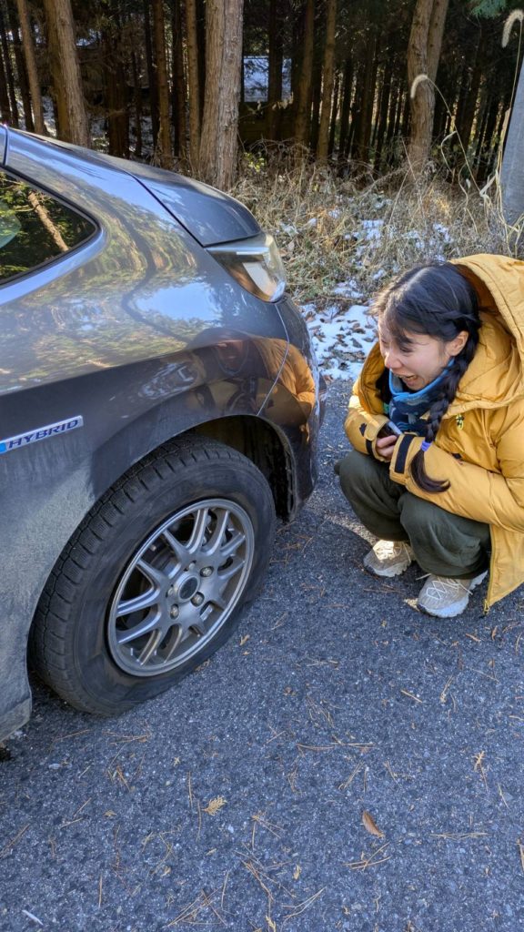 そんなこんなでモチベ高く気合い入れて木曽側から歩いて上がることにしたのに、登山口の駐車場付近でタイヤがパンク。。。