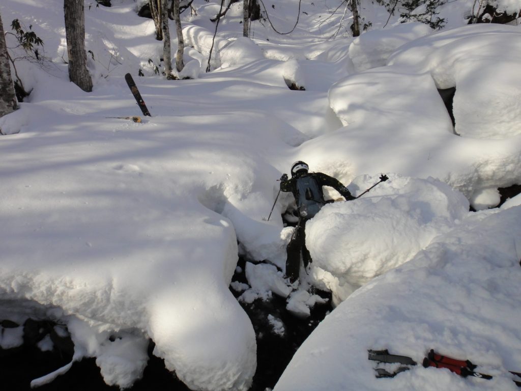 時折樹間が広がるとホッとして楽しめるが、すぐにまた密となる。時間的余裕がたっぷりとはないのでドンドン降っていったら、沢の渡渉地点を少し過ぎたようだ。渡れさえすればいいので沢へと降るが、一跨ぎとは行かない川幅のためルート工作を奥田隊長がしてくれた。ちょいとドボンはしたものの見事に渡りきり、スキー場へと戻ることができた。