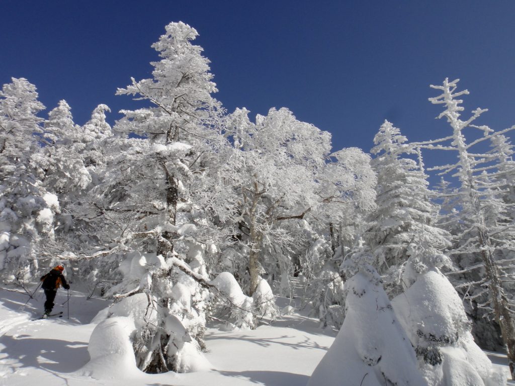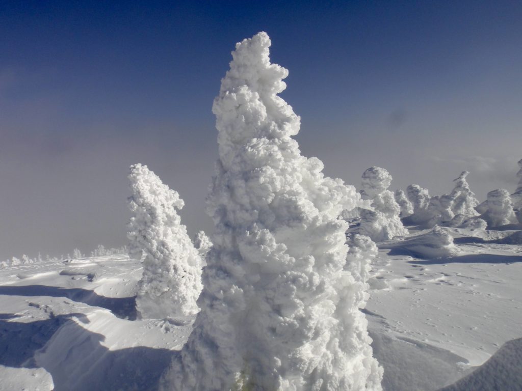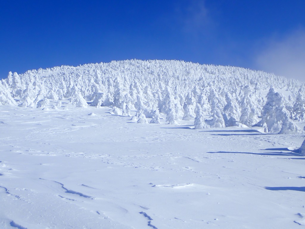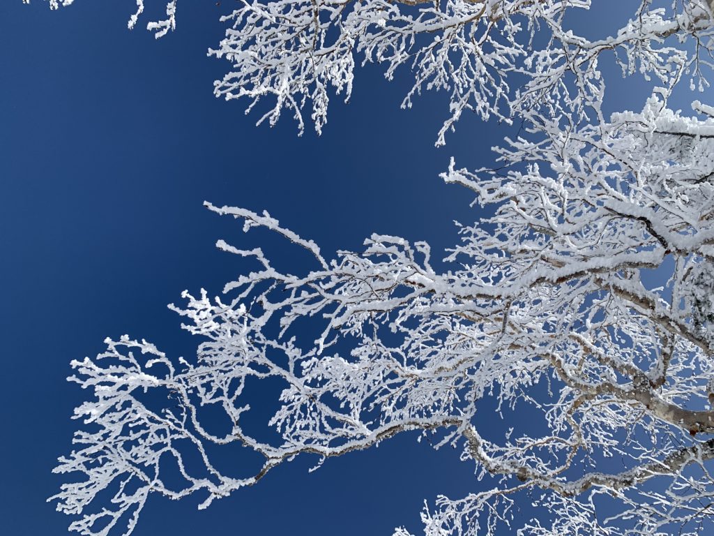 青い空は海を思わせる深さだ。霧氷の厚化粧をした木々は、まるでサンゴのようで美しい。その間を泳ぐように登っているのは、二人である。自分はヨタヨタと溺れないように進んでゆく。