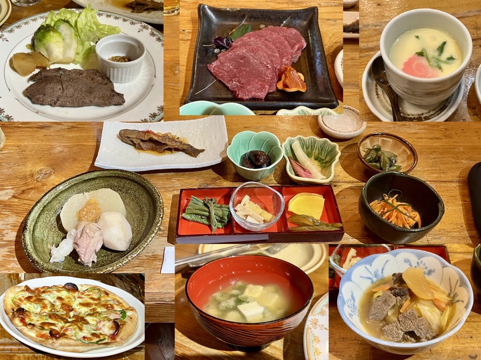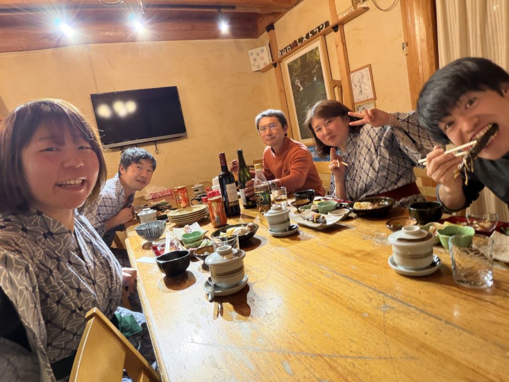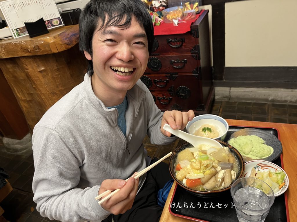 帰路へとつく前に女性陣が夕食にと決めていたお店「鞍手茶屋 中山峠店」へ。各自好きなものを頼むが、どれも美味しいだけではなくボリュームがすごい。大きな具だらけのけんちん汁、極太で食べ応えがあり過ぎるうどん、つきたてのような柔らか餅、副菜も充実しており、誰もがお腹いっぱい!大満足でした。