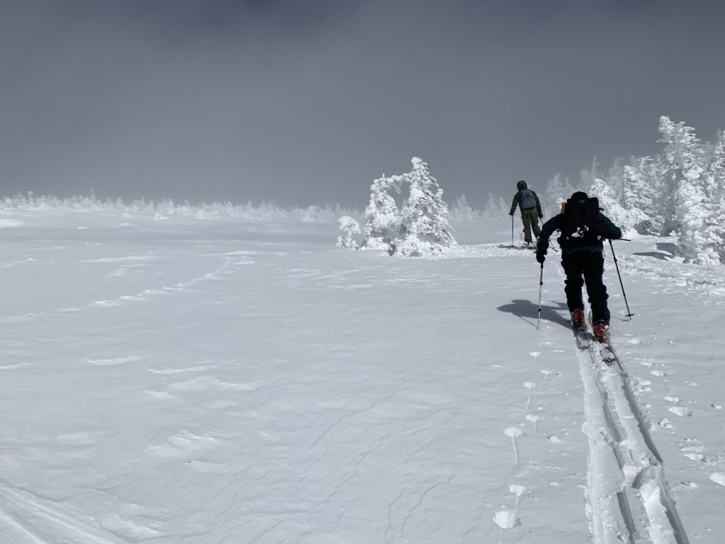 ガス領域に近づいたので装備を整え、いざ参る!と気合いを入れたが予想に反してそれほど風が強くはない。しかしムラのあるガスが濃いと極端に見えにくい。でも一瞬晴れて樹氷に光差す光景は見惚れてしまう。